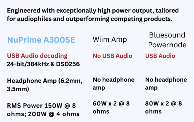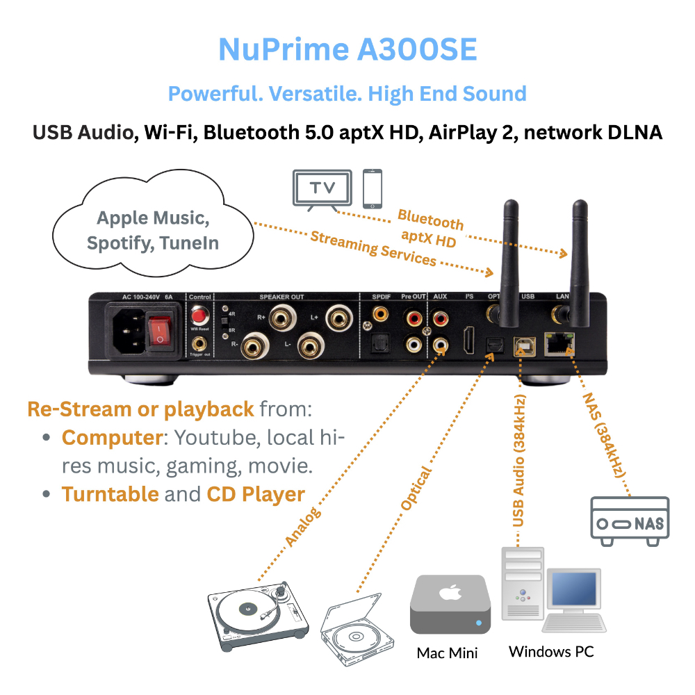 A combination of high-power Class-D amplifier, 64-bit quad-core Arm Cortex-A53 processor, NuPrime proprietary SRC chip, Cirrus Logic CS43131 DAC, plus other audiophile-grade components enable the Omnia A300SE to achieve world class performance above its peers.