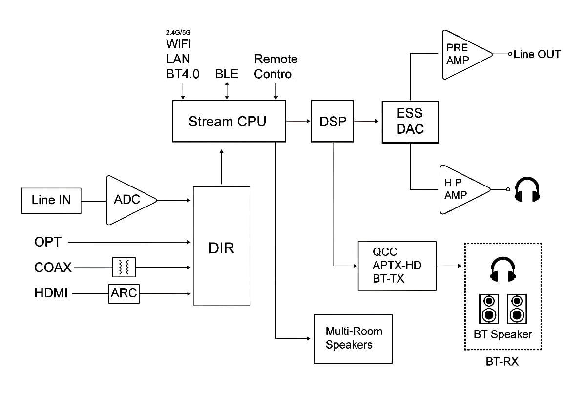 WR-2 versatility lies in its architectural design, where all inputs, Wi-Fi, and Bluetooth data are routed to a streaming CPU module for processing. The digital data can be re-streamed to multi-room Wi-Fi receivers or a Bluetooth device or decoded for lineout or headphone out.